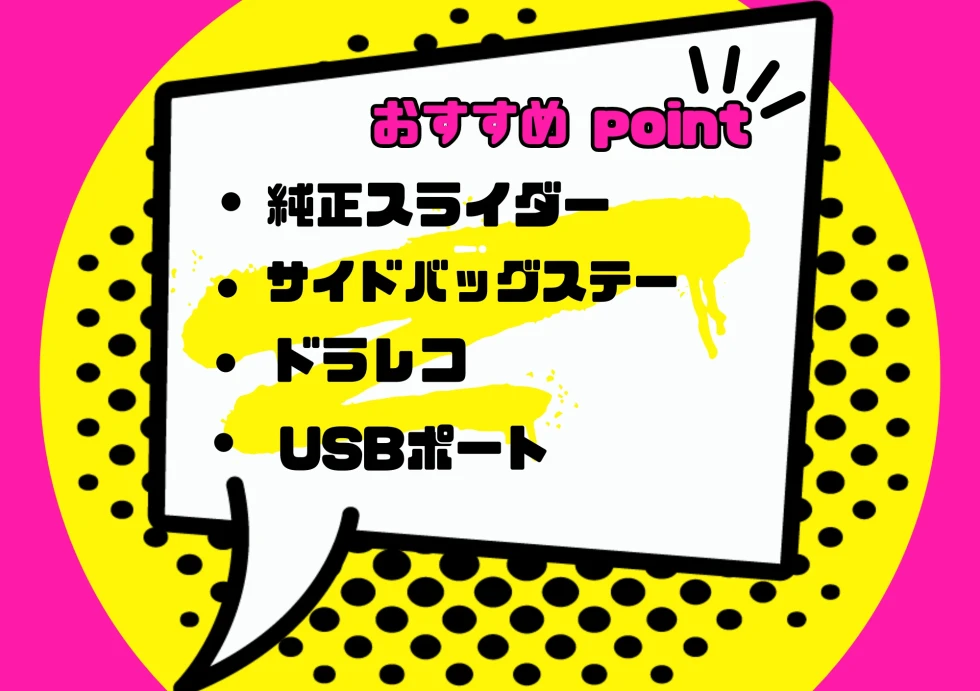 サイドバックサポートでお好きなバックで積載量UP、バックレスト装備でタンデム走行も楽に!