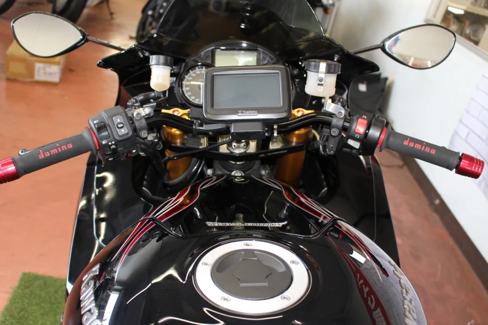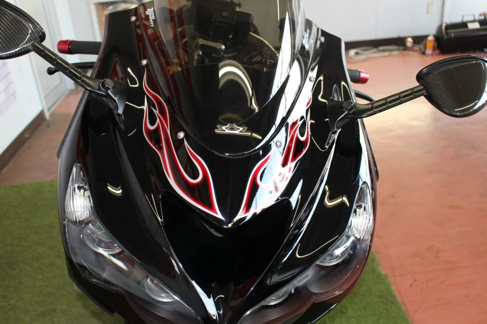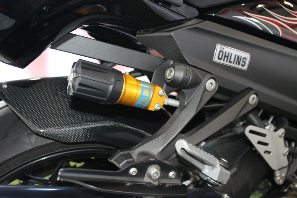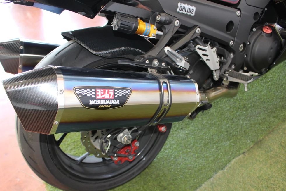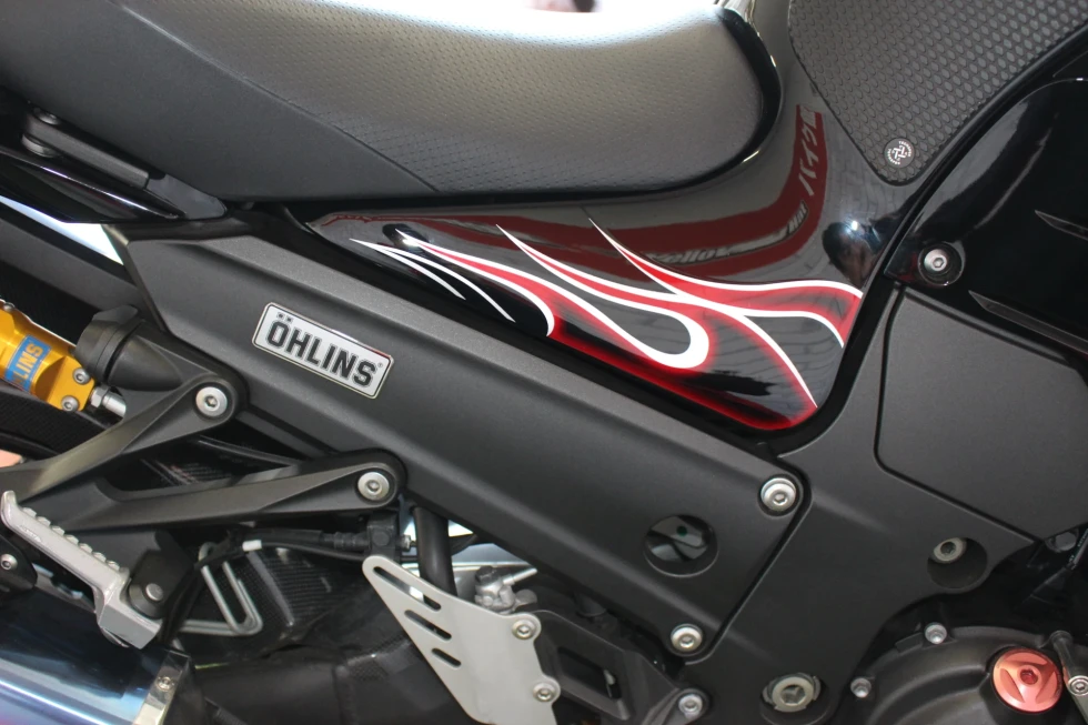 オーリンズサスペンション、ヨシムラマフラー、ハリケーンハンドル、ベビーフェイススライダー、ゼログラビティシールド、フェンダーレス装備!