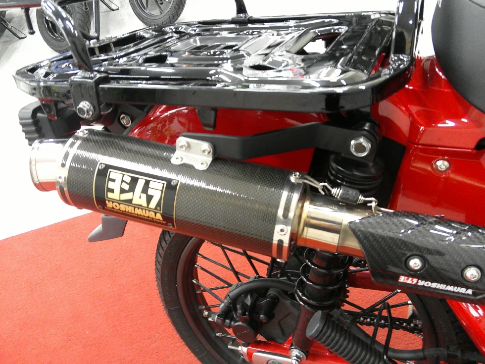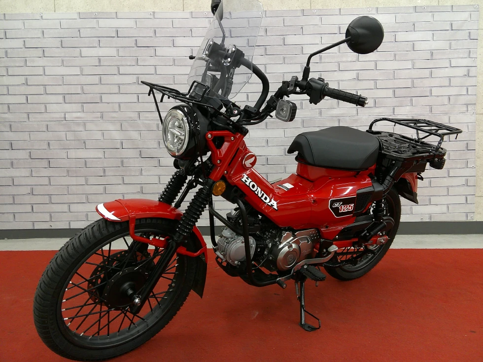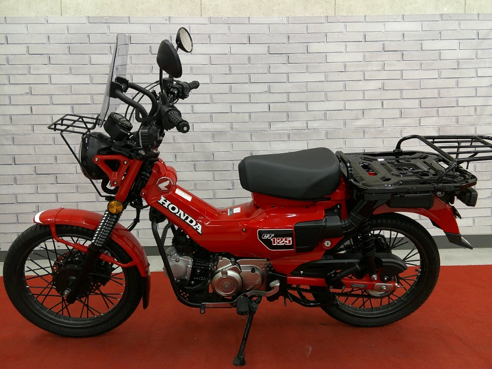 ヨシムラマフラー装備の赤いCT125!排気音も重低音のある迫力ある音に変化しております。その他スクリーン装備やキャリアなどツーリングに役立つ装備が多数!楽しく経済的なバイクをお探しの方におススメの一台!