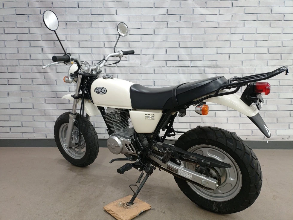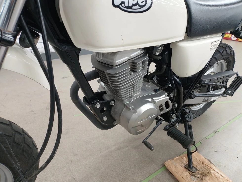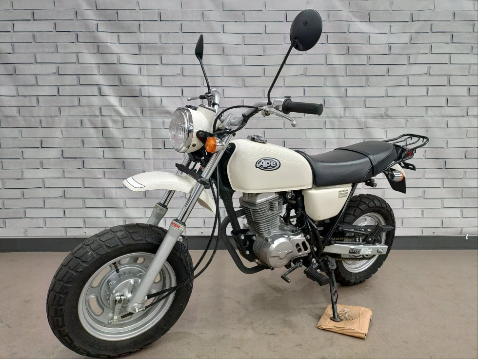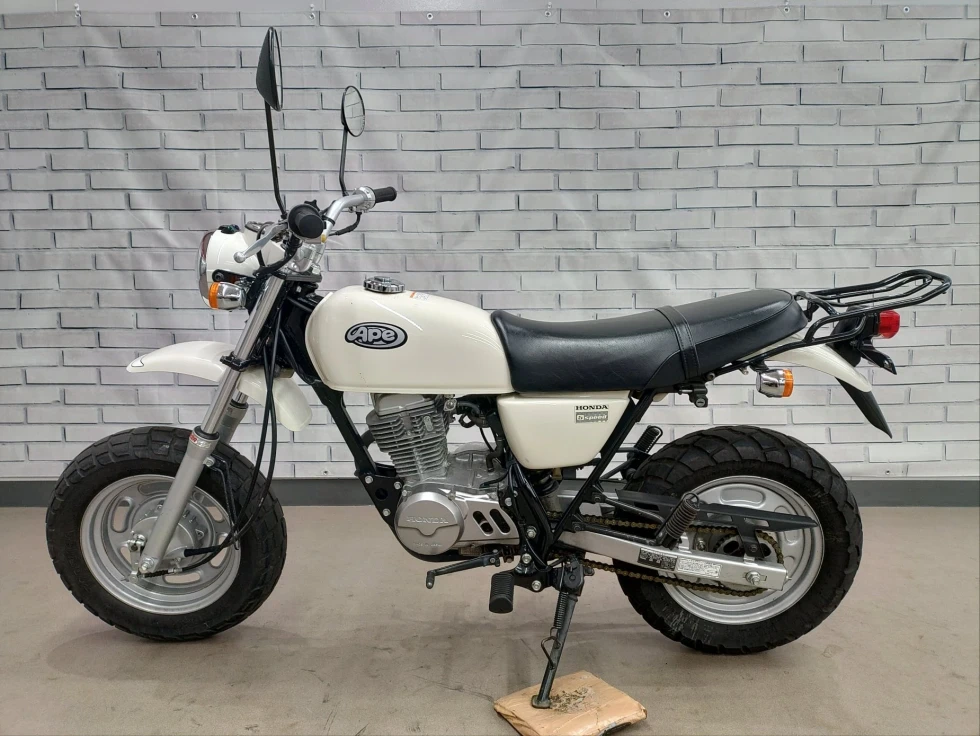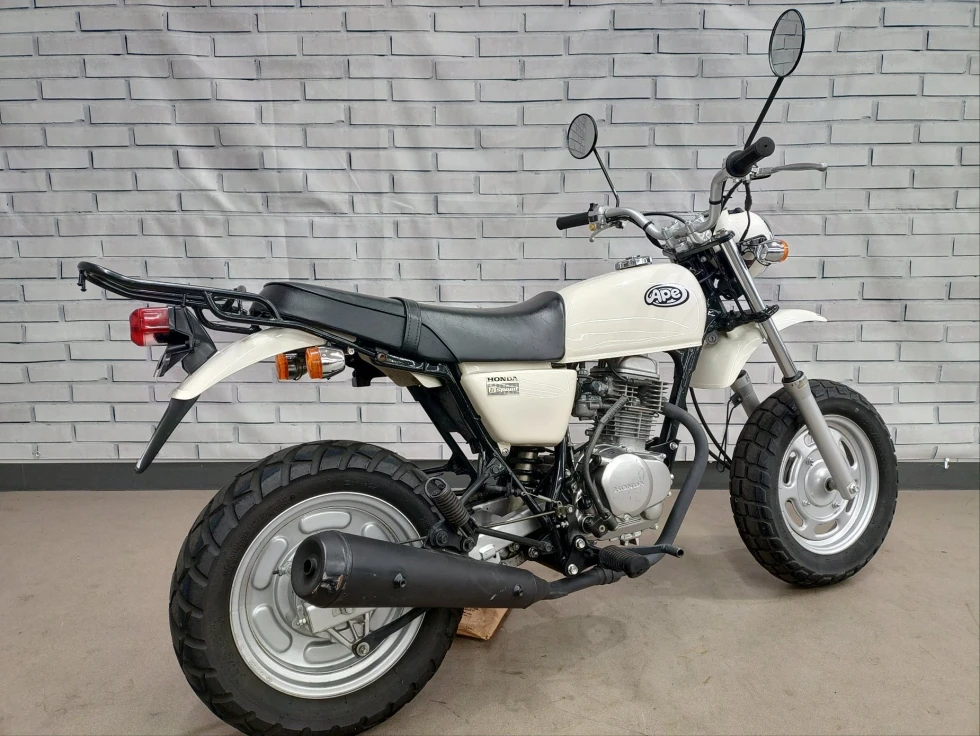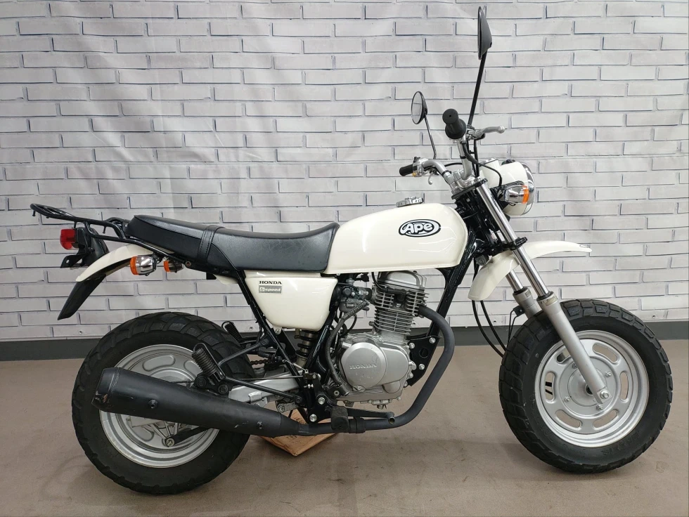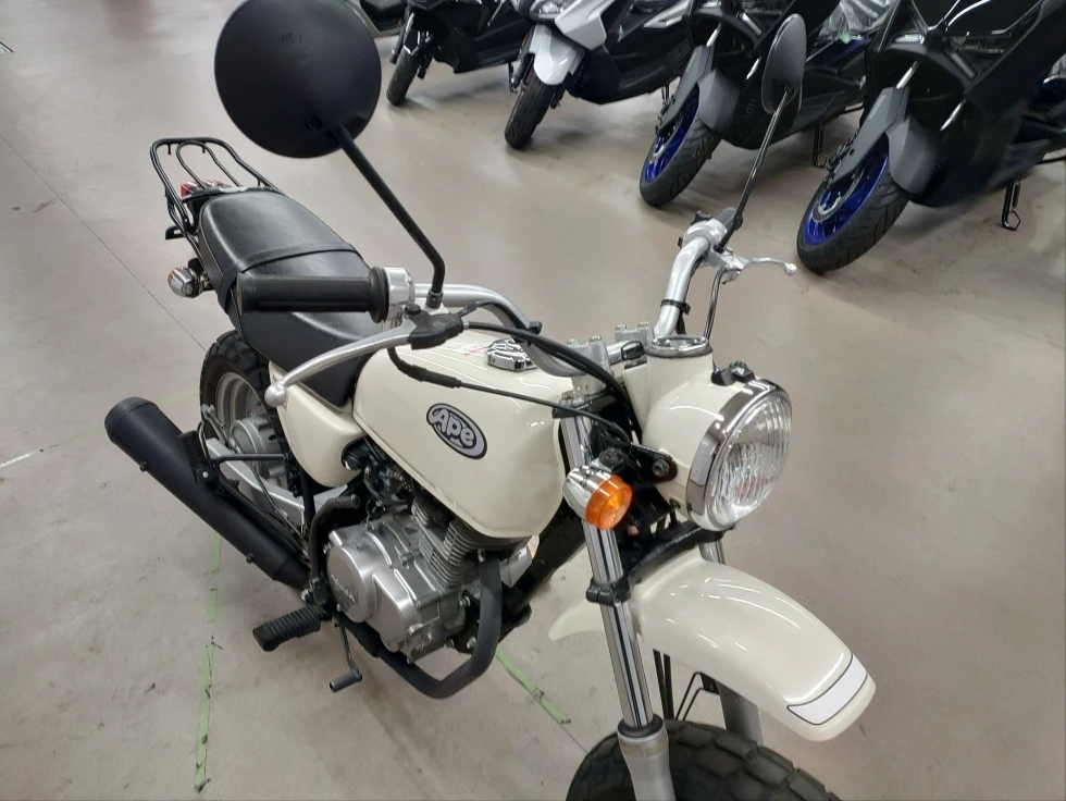 2006年モデル エイプ100 展示中です。2002年に登場した、ギアチェンジの面白さを体感できる、ベーシックスポーツモデル。コンパクトなボディに7psを発揮する空冷単気筒SOHC5MTエンジンを搭載し、バッテリーを必要としないキック始動モデルでシンプルでカスタムし易い1台となっています。便利なキジマ社製キャリヤ付き今となっては希少な1台です!!!
