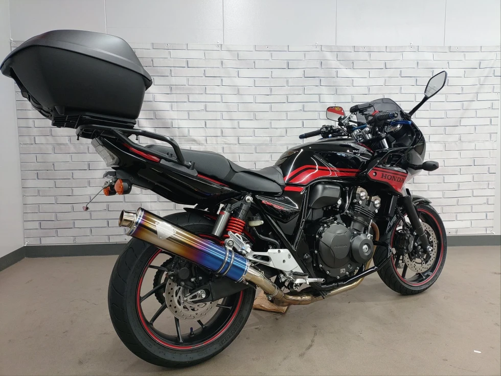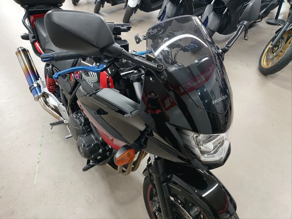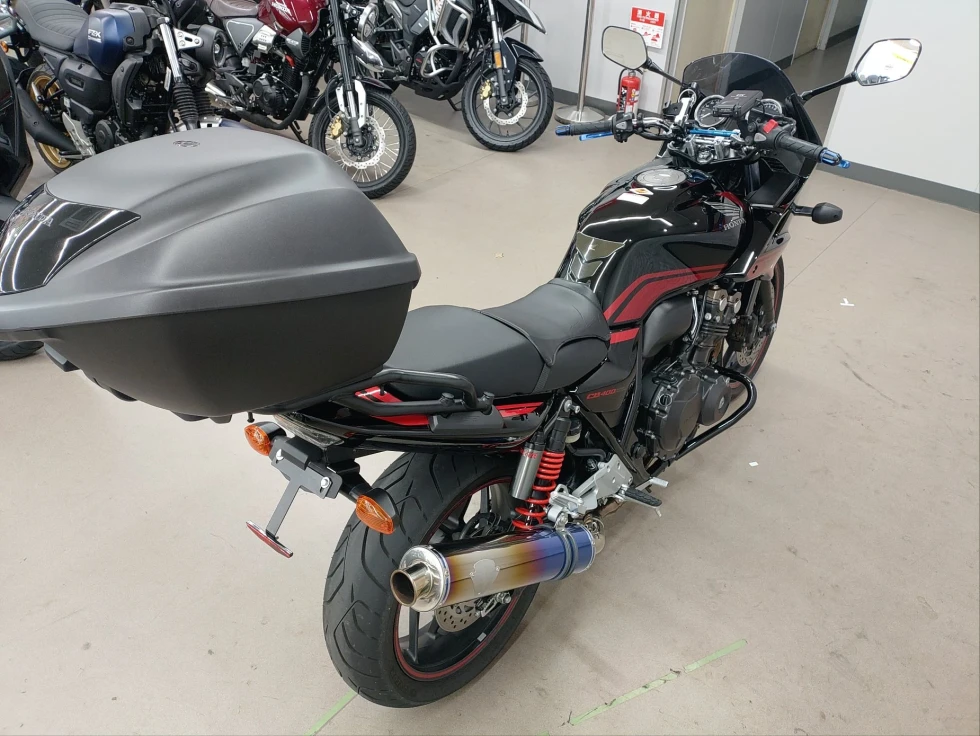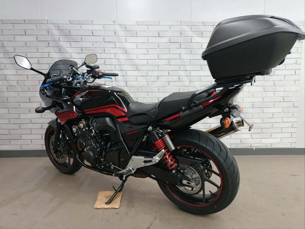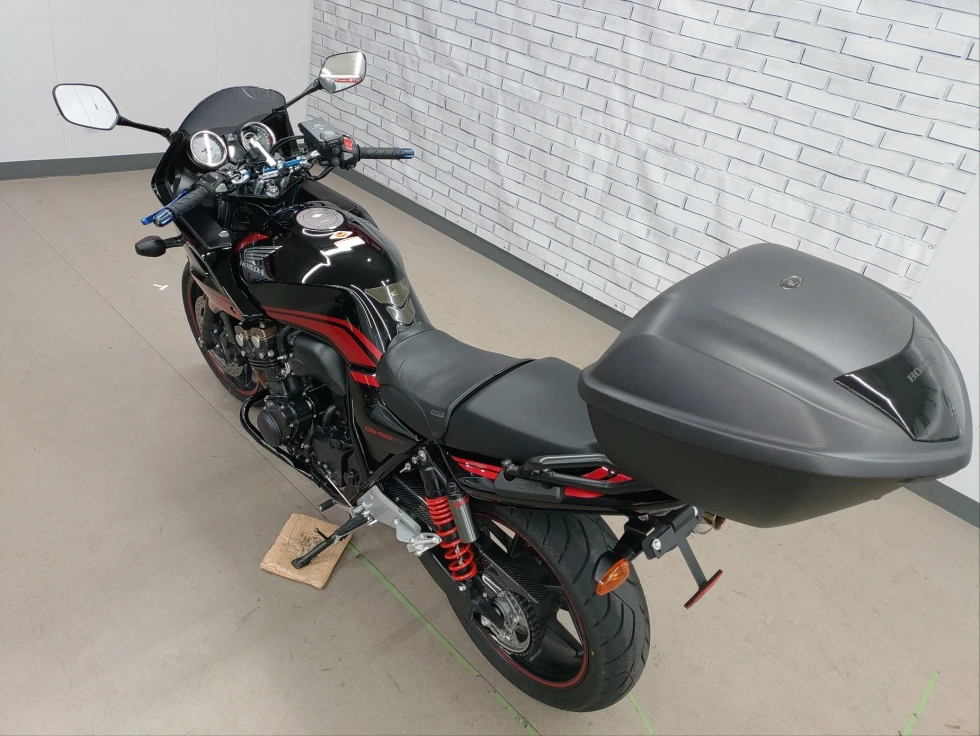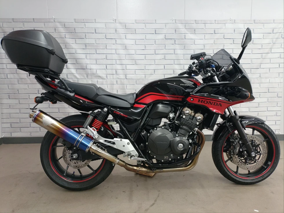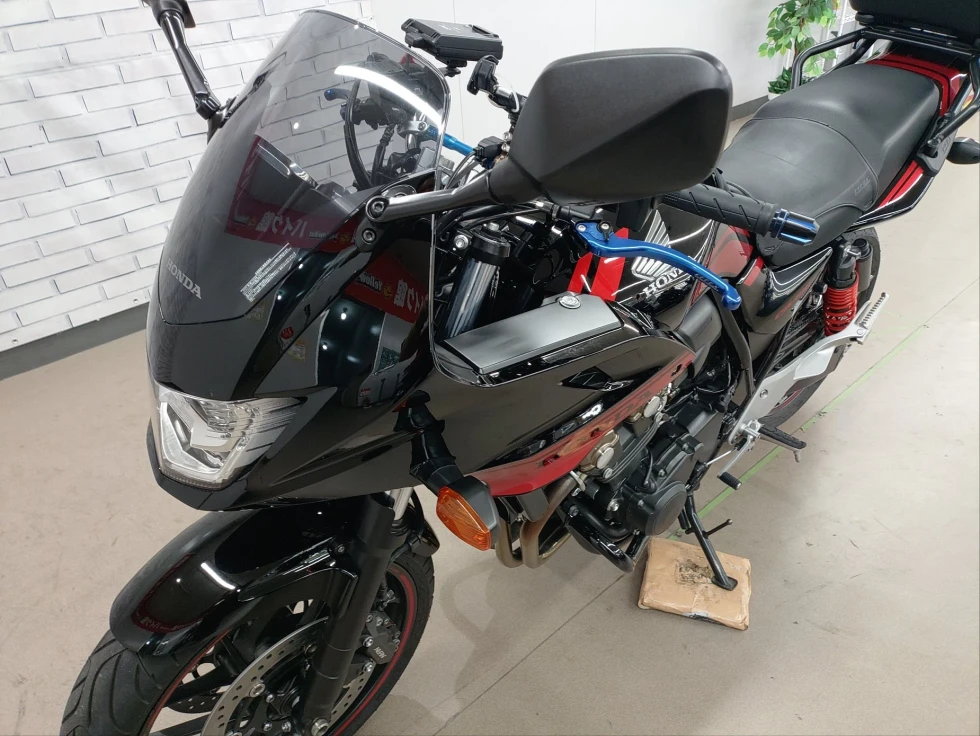 2016年モデル CB400SB ABS 期間限定受注モデル展示中です。教習車でもおなじみのCB400SFをベースに高速走行時の安定性向上をはかったハーフカウルを装備したバリエーションモデルで、こちらの車輌は「うるし塗り」を塗装で表現した漆黒をイメージさせるグラファイトブラックを採用し、レッドのストライプパターンやシリンダーヘッドのブロンズカラー、ダークシルバーのリアサスリザーバタンクの特別な車体カラーとなっています。メインキーで開閉脱着可能な純正ワンキーボックス、車検対応ワイバン社製スリップオンマフラー、エンジンガード、フェンダーレス、カーボンインナーフェンダー、ETC、USB電源他のカスタム多数、コンディション良好のお買い得車輌です!!!