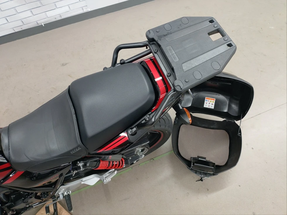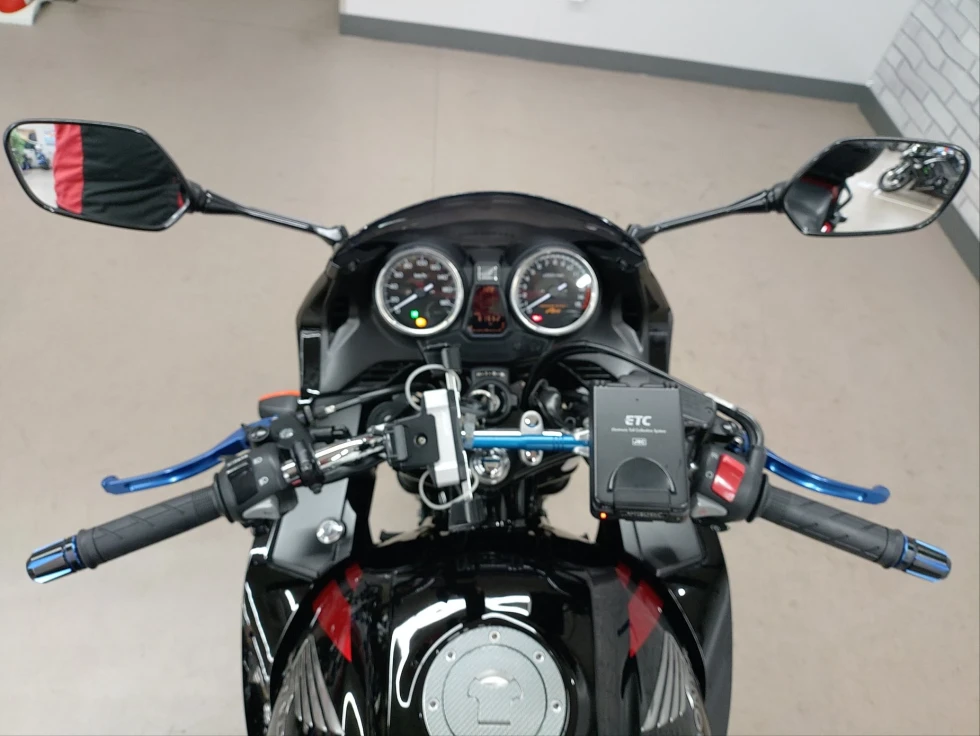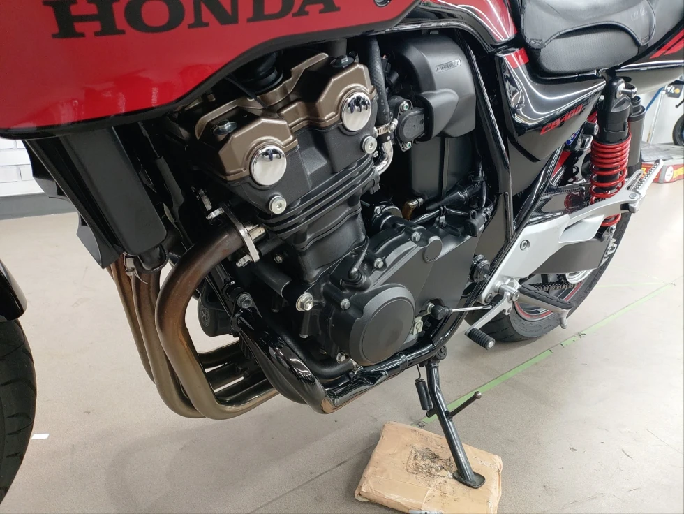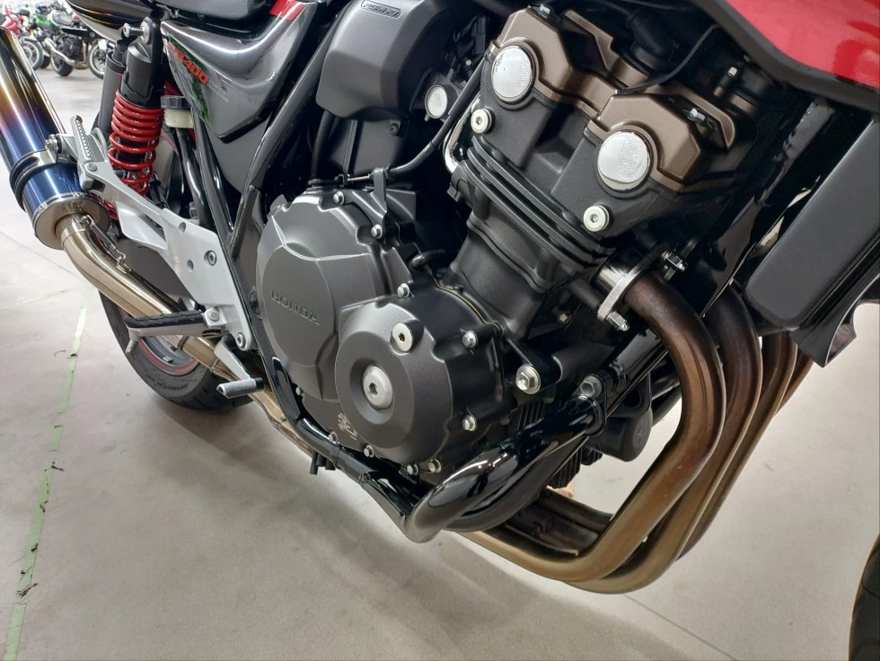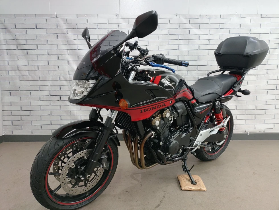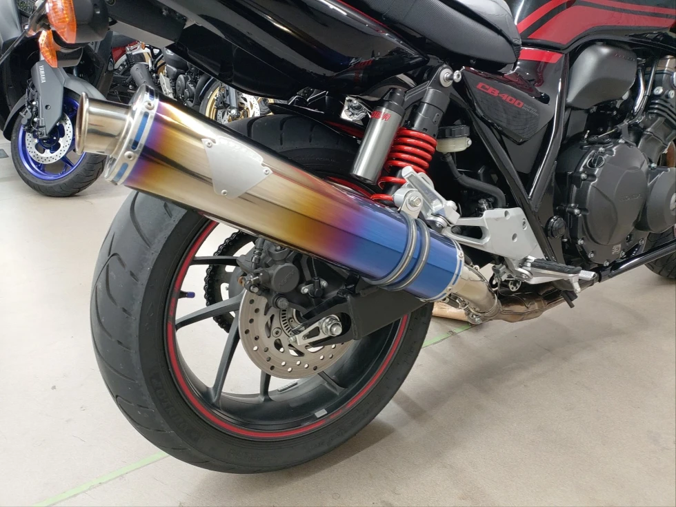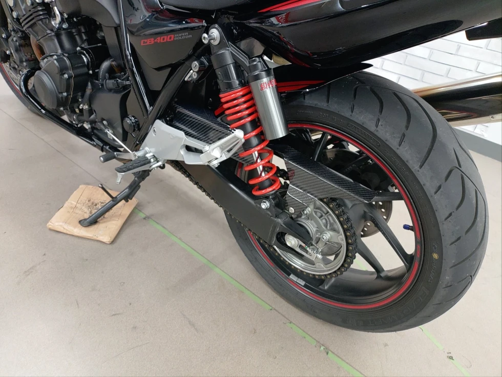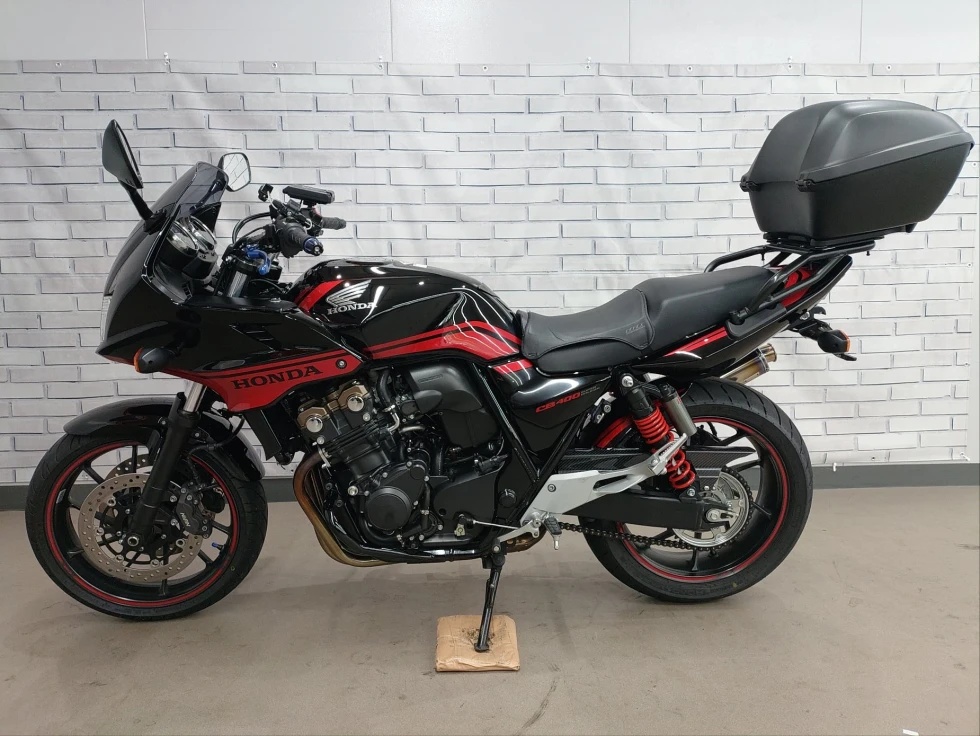 2016年モデル CB400SB ABS 期間限定受注モデル展示中です。教習車でもおなじみのCB400SFをベースに高速走行時の安定性向上をはかったハーフカウルを装備したバリエーションモデルで、こちらの車輌は「うるし塗り」を塗装で表現した漆黒をイメージさせるグラファイトブラックを採用し、レッドのストライプパターンやシリンダーヘッドのブロンズカラー、ダークシルバーのリアサスリザーバタンクの特別な車体カラーとなっています。メインキーで開閉脱着可能な純正ワンキーボックス、車検対応ワイバン社製スリップオンマフラー、エンジンガード、フェンダーレス、カーボンインナーフェンダー、ETC、USB電源他のカスタム多数、コンディション良好のお買い得車輌です!!!