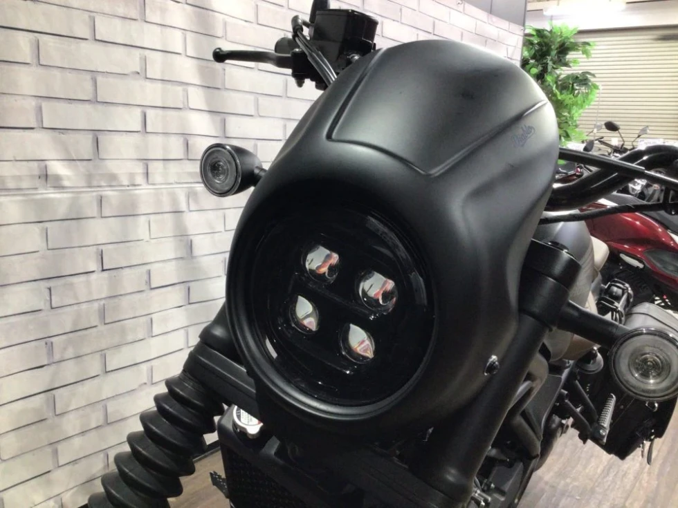 REBELのカスタムパーツで定評のあるDIABLO製のライトカバー装備で、ノーマルとは違った迫力のあるデザインに!