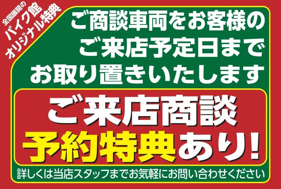 バイク館全店で【商談予約割引】を実施しております。まずはお近くの店舗に在庫確認をお願い致します。