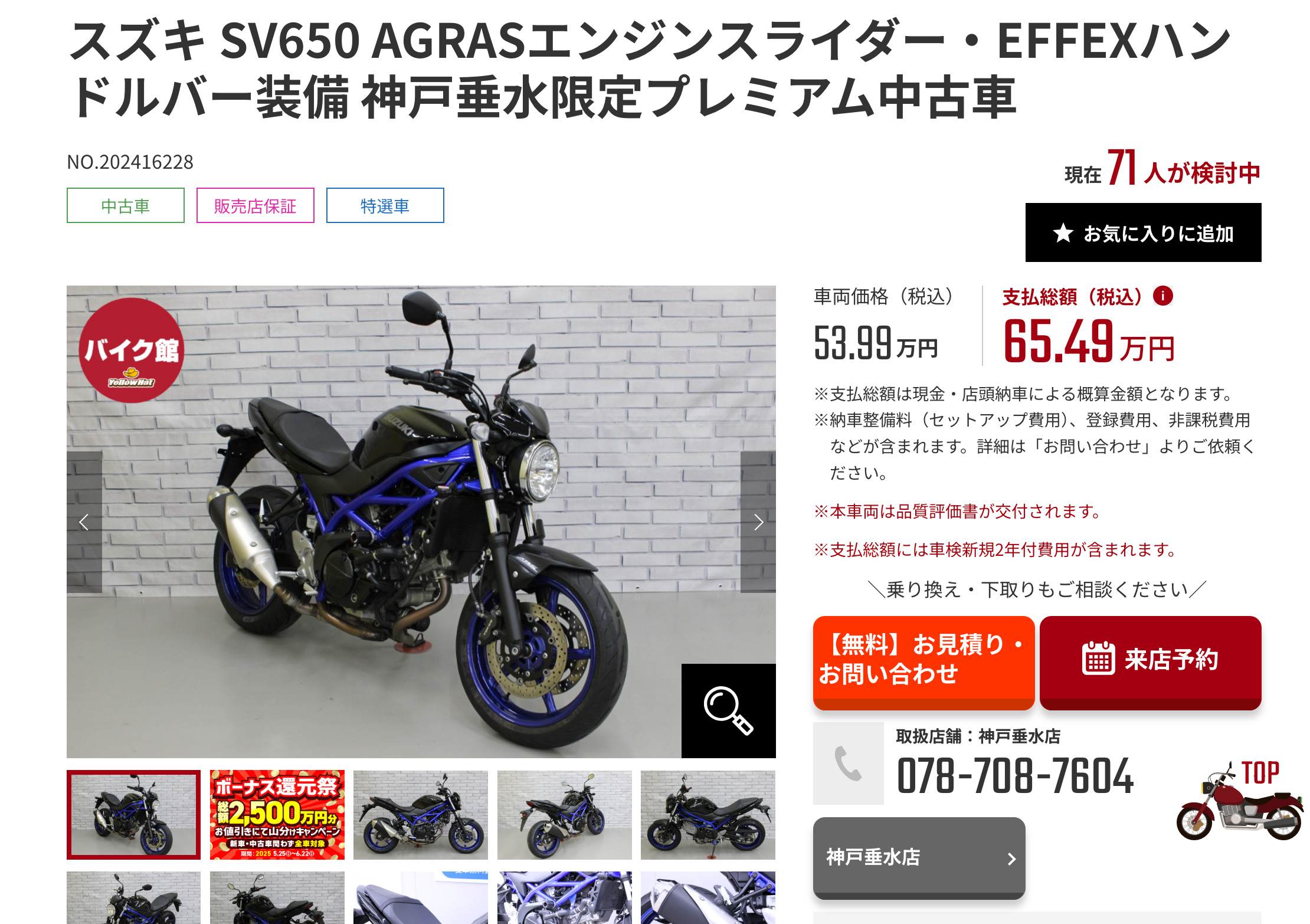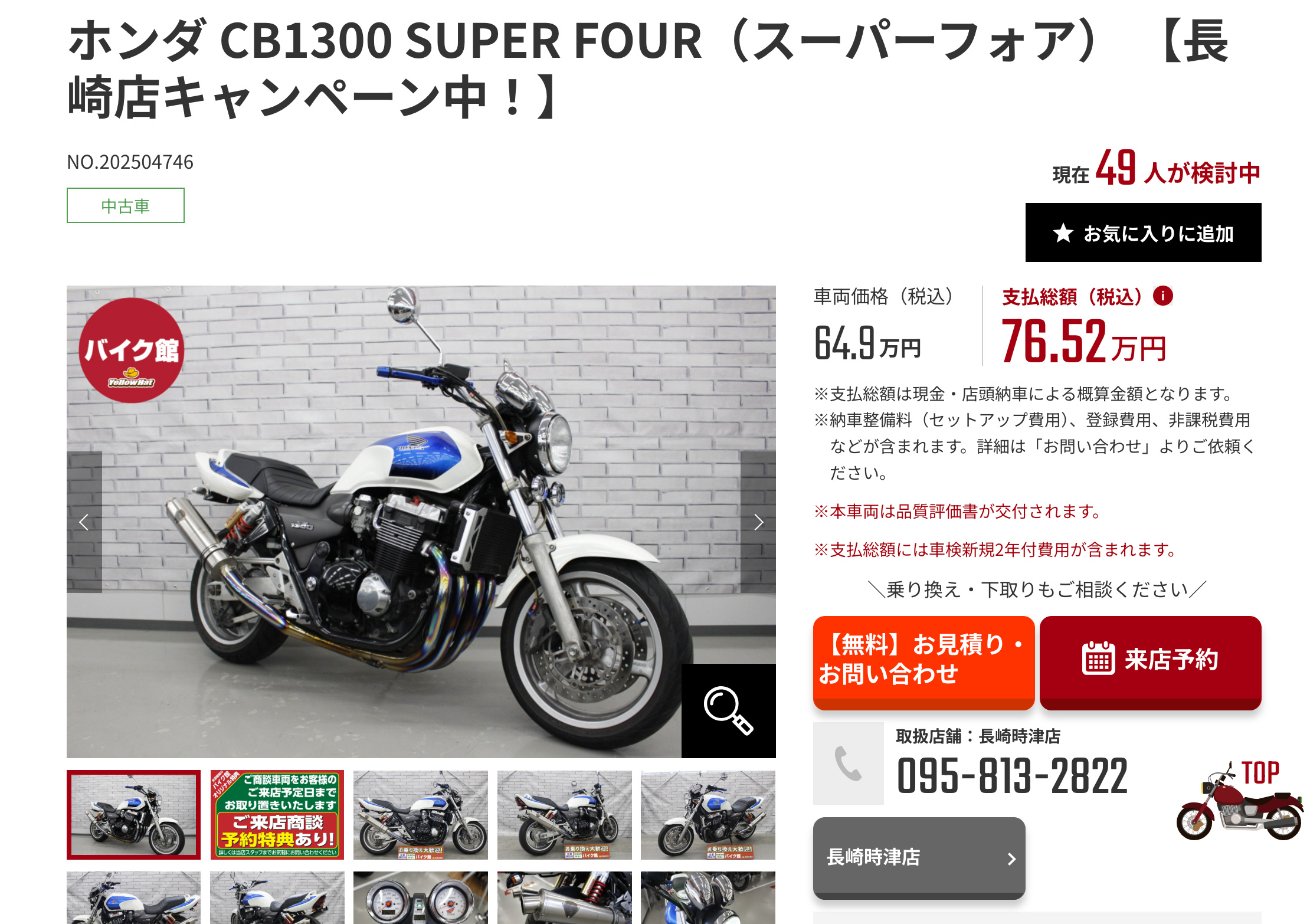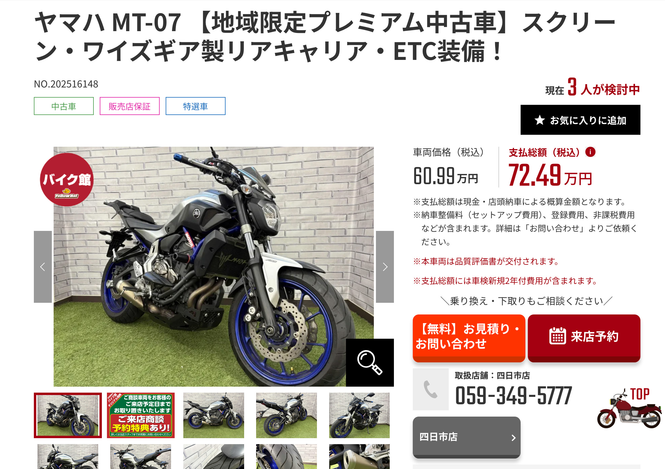 掲載車両は納車前にプロの点検整備が実施され、品質評価書や販売店保証が付くバイクも多数あります。車検が必要なモデルは「車検の残り期間」を総額に含む表示があり、ETC装着やスライダー装備など、装備の状態も明示されています。