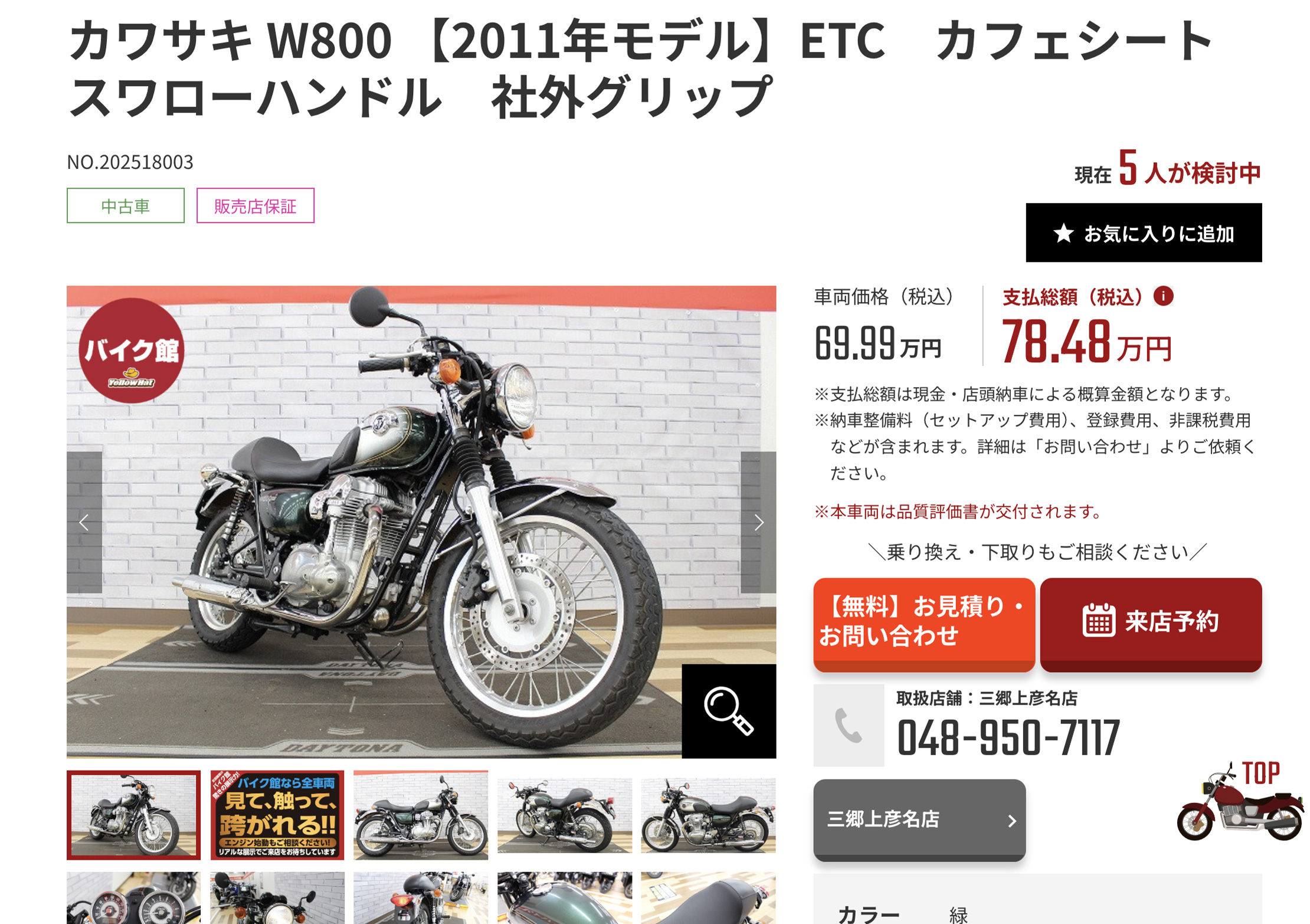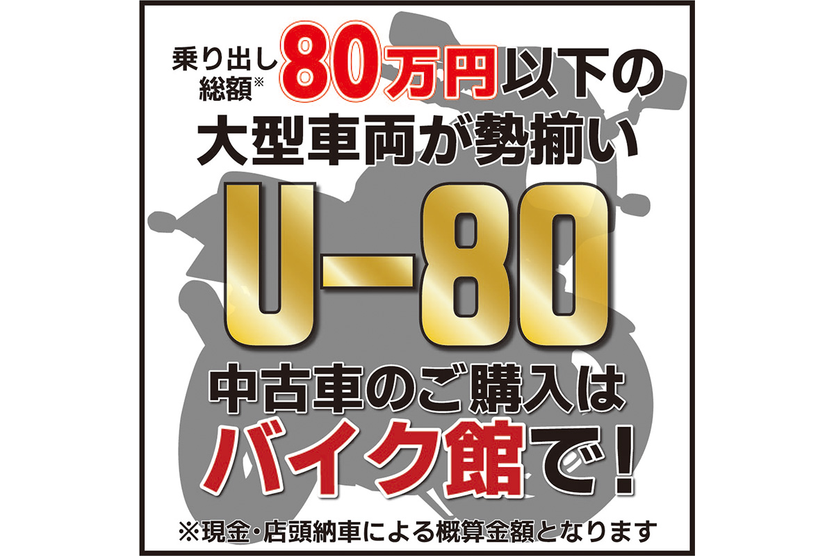 「U-80」は「支払総額80万円以下」に限定した大型中古車(401cc~)の特集です。支払総額とは車両本体に登録・整備などの諸費用を加えた、店頭納車ベースの概算金額を指します。Ninja650やSV650、MT-07、W800、CB1100、XG750、Monster796など、幅広いジャンルのバイクが並びます。店舗にない在庫もお取り寄せのご相談が可能です。
